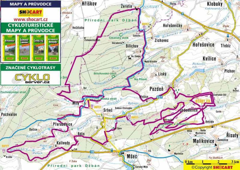 fialová čára = dlouhá trasa, 75 km světle fialová přerušovaná = zkrácení (celkem 3 zkrácení) pro krátkou trasu 45 km